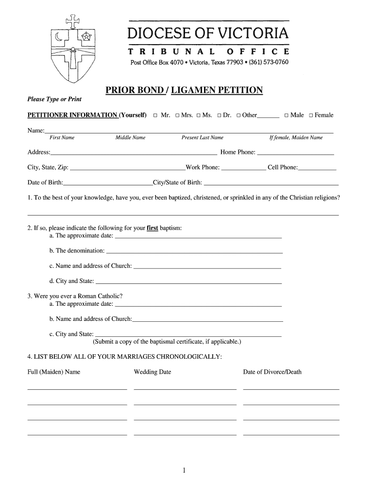 Get the free PRIOR BOND / LIGAMEN PETITION - victoriadiocese