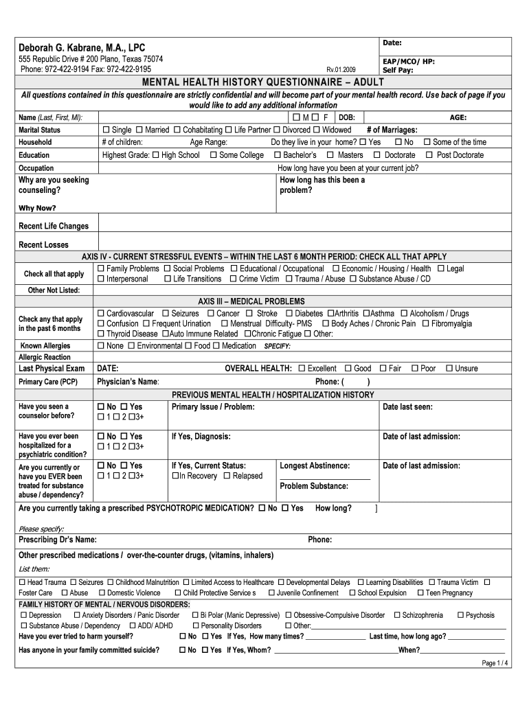 Date: Deborah G. Karate, M.A., LPC 555 Republic Drive # 200 Plano, Texas 75074 Phone: 9724229194 Fax: 9724229195 EAP/MCO/ HP: Self Pay: RV.01.2009 MENTAL HEALTH HISTORY QUESTIONNAIRE ADULT All questions