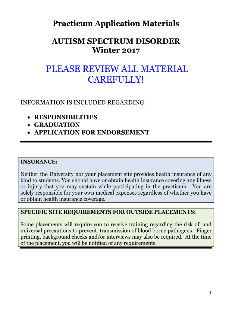 Practicum Application Materials AUTISM SPECTRUM DISORDER Winter 2017 PLEASE REVIEW ALL MATERIAL CAREFULLY! INFORMATION IS INCLUDED REGARDING: RESPONSIBILITIES GRADUATION APPLICATION FOR ENDORSEMENT