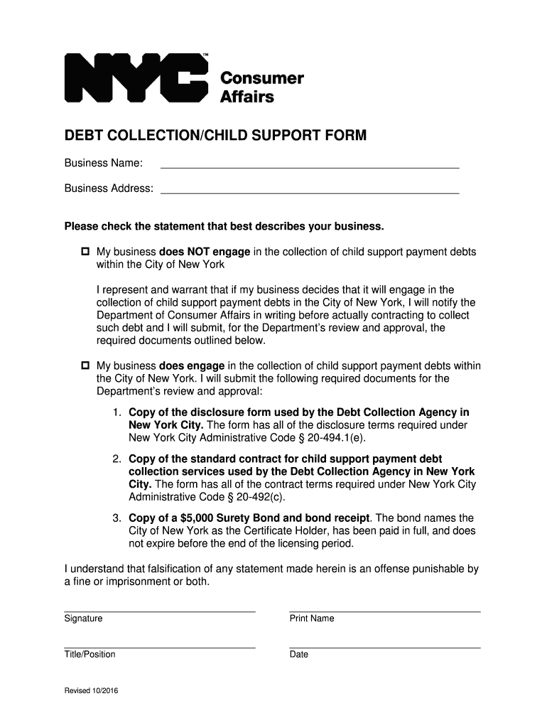 DEBT COLLECTION/CHILD SUPPORT FORM Business Name: Business Address: Please check the statement that best describes your business. My business does NOT engage in the collection of child support payment