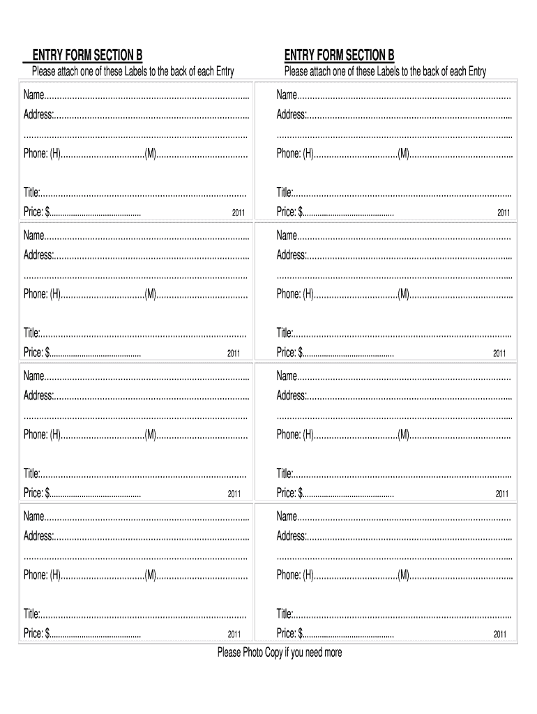 The Entry Form Section B is a crucial component for collecting necessary entry information. This form serves to organize essential details such as the name, address, phone number, title, and price of each entry. Designed for practical use, it can be attached to the back of entries and easily photocopied, providing a convenient solution for multiple submissions.