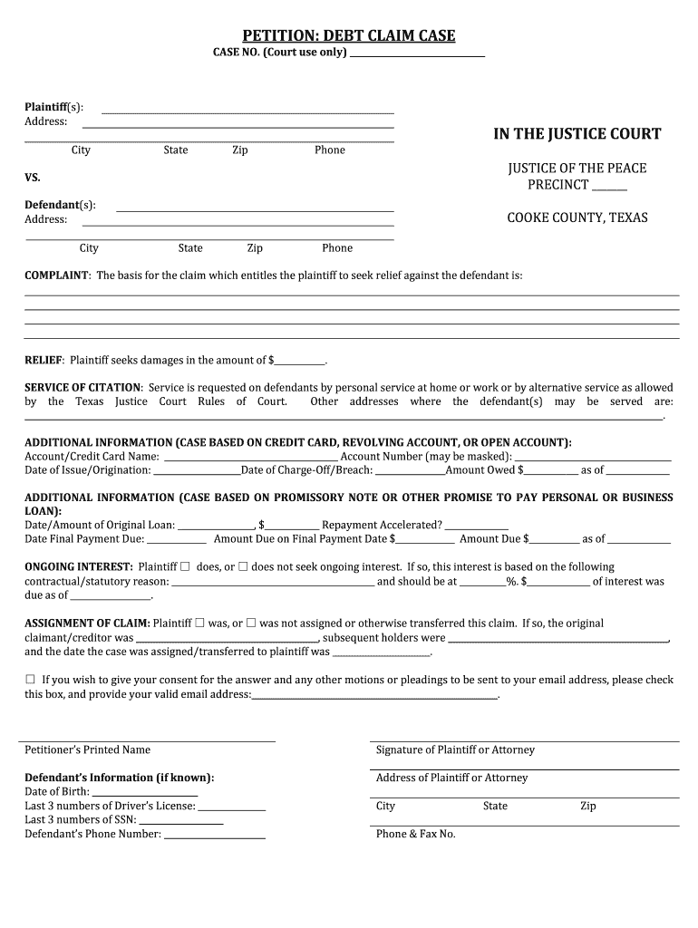 PETITION: DEBT CLAIM CASE NO. (Court use only) Plaintiff(s): Address: VS. City Defendant(s): Address: City State Zip Phone IN THE JUSTICE COURT JUSTICE OF THE PEACE PRECINCT COOKE COUNTY, TEXAS Phone