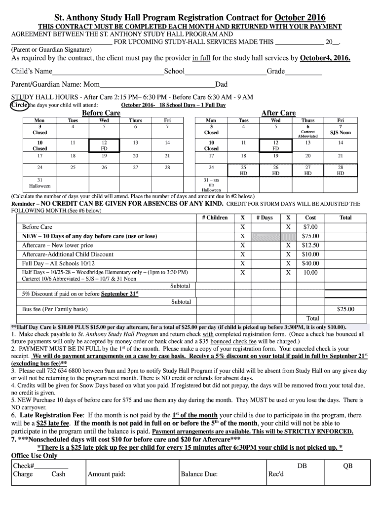 St. Anthony Study Hall Program Registration Contract for October 2016 THIS CONTRACT MUST BE COMPLETED EACH MONTH AND RETURNED WITH YOUR PAYMENT AGREEMENT BETWEEN THE ST. ANTHONY STUDY HALL PROGRAM