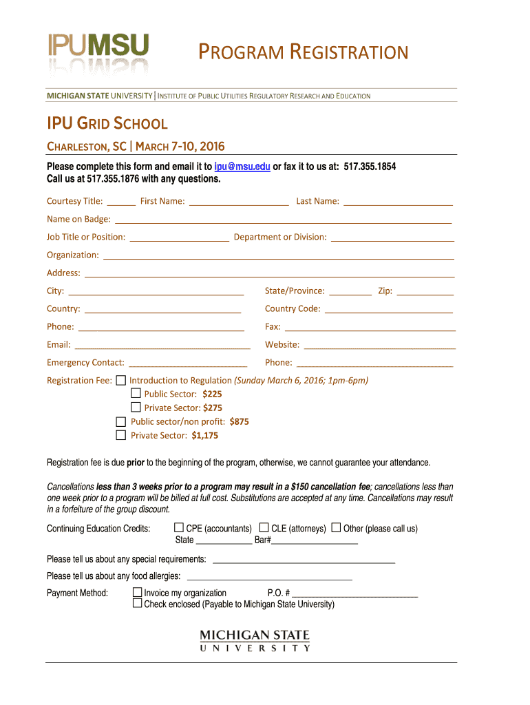 Program registration. Michigan State University institute of public utilities regulatory research and education. CPU grid school. Charleston, SC march 7-10, 2016
