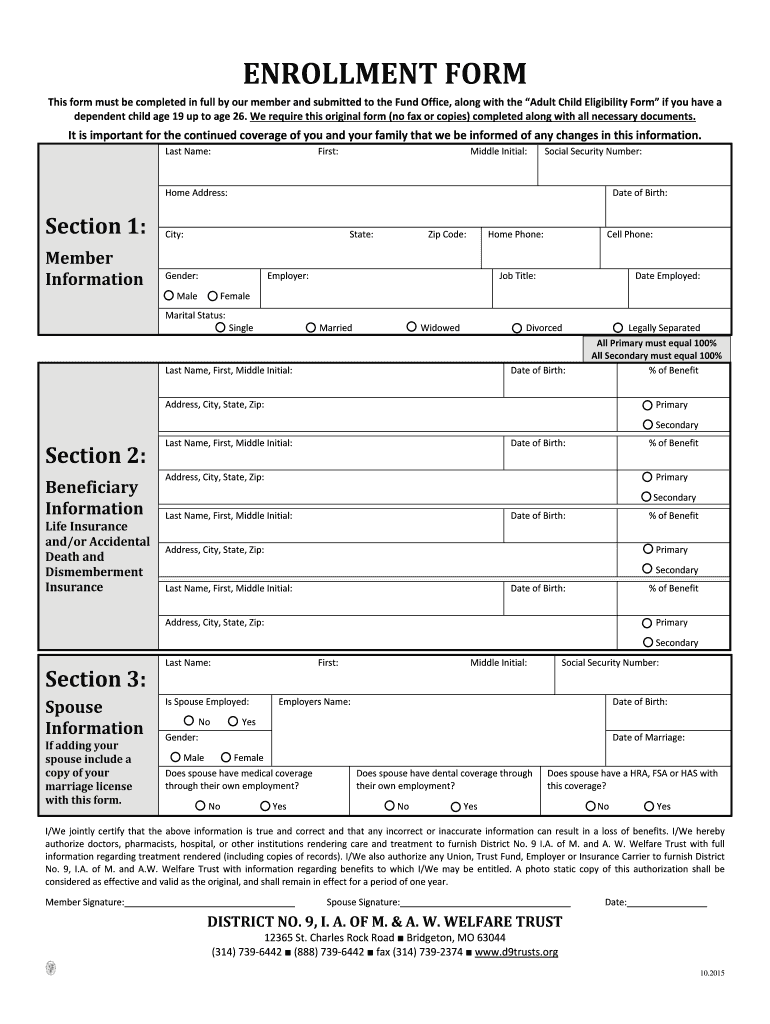Get the free Enrollment Form with Required Document List - d9trusts