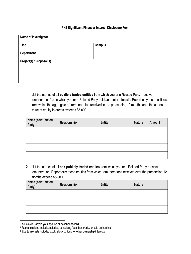 PHS Significant Financial Interest Disclosure Form Name of Investigator Title Campus Department Project(s) / Proposal(s) 1. List the names of all publicly traded entities from which you or a Related