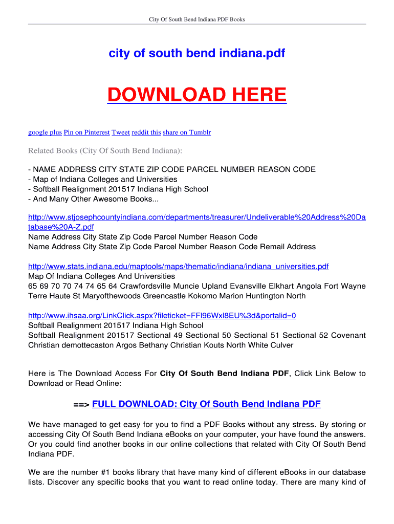 City Of South Bend Indiana PDF Books city of South Bend indiana.pdf DOWNLOAD HERE google plus Pin on Pinterest Tweet Reddit this share on Tumblr Related Books (City Of South Bend Indiana): NAME ADDRESS