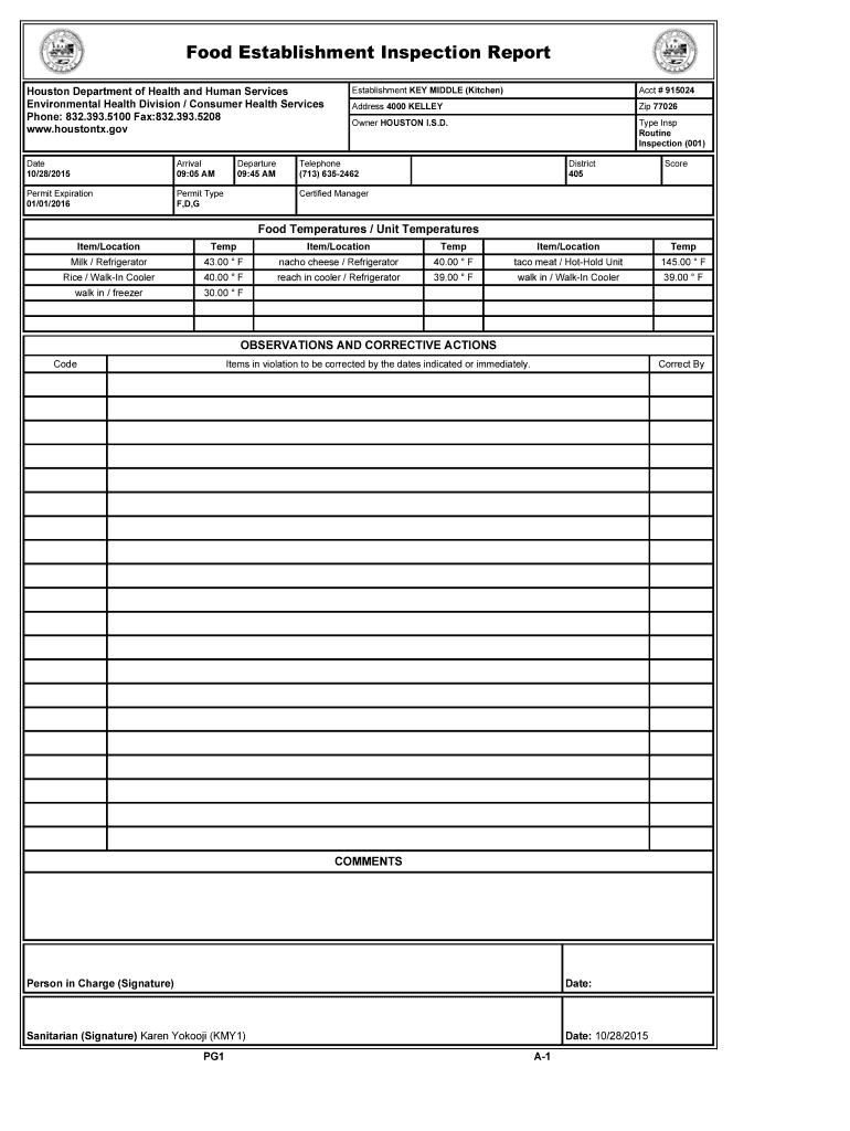 Food Establishment Inspection Report Houston Department of Health and Human Services Environmental Health Division / Consumer Health Services Phone: 832.393.5100 Fax:832.393.5208 www.houstontx.gov