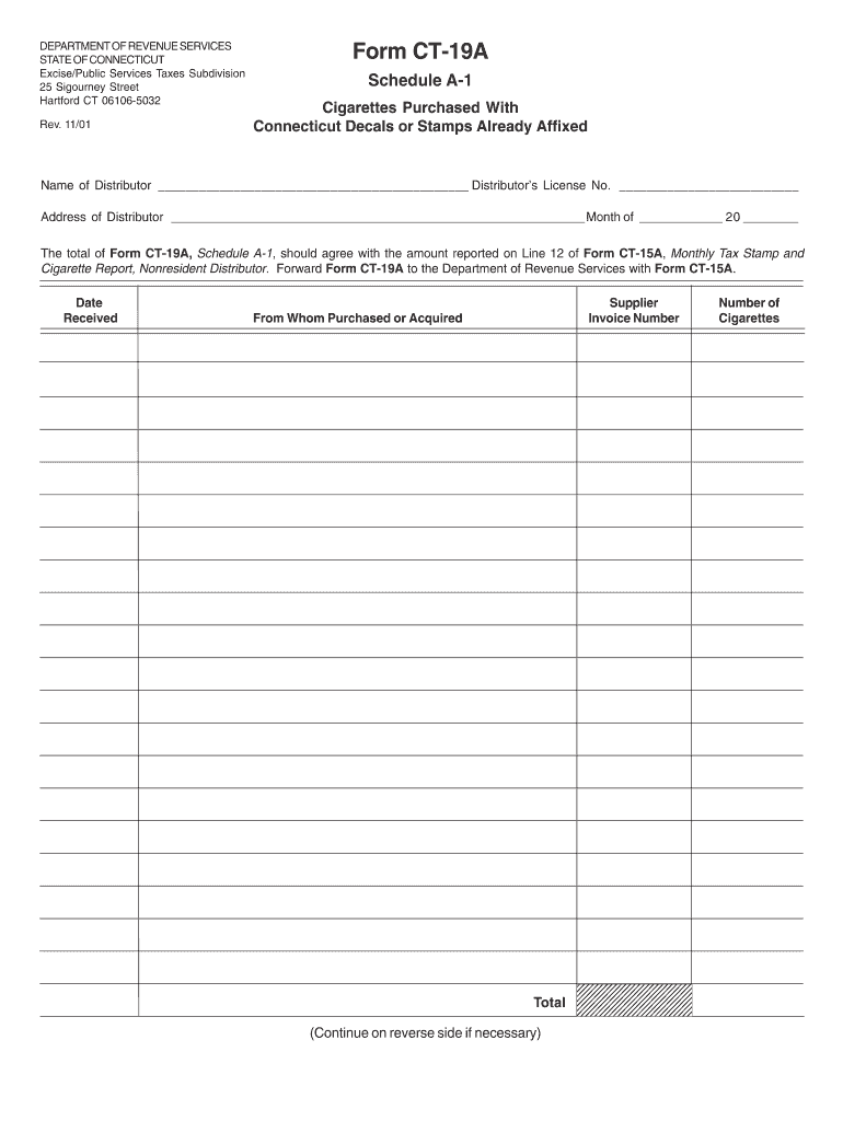 DEPARTMENT OF REVENUE SERVICES STATE OF CONNECTICUT Excise/Public Services Taxes Subdivision 25 Sigourney Street Hartford CT 061065032 Rev. 11/01 Form CT19A Schedule A1 Cigarettes Purchased With Connecticut