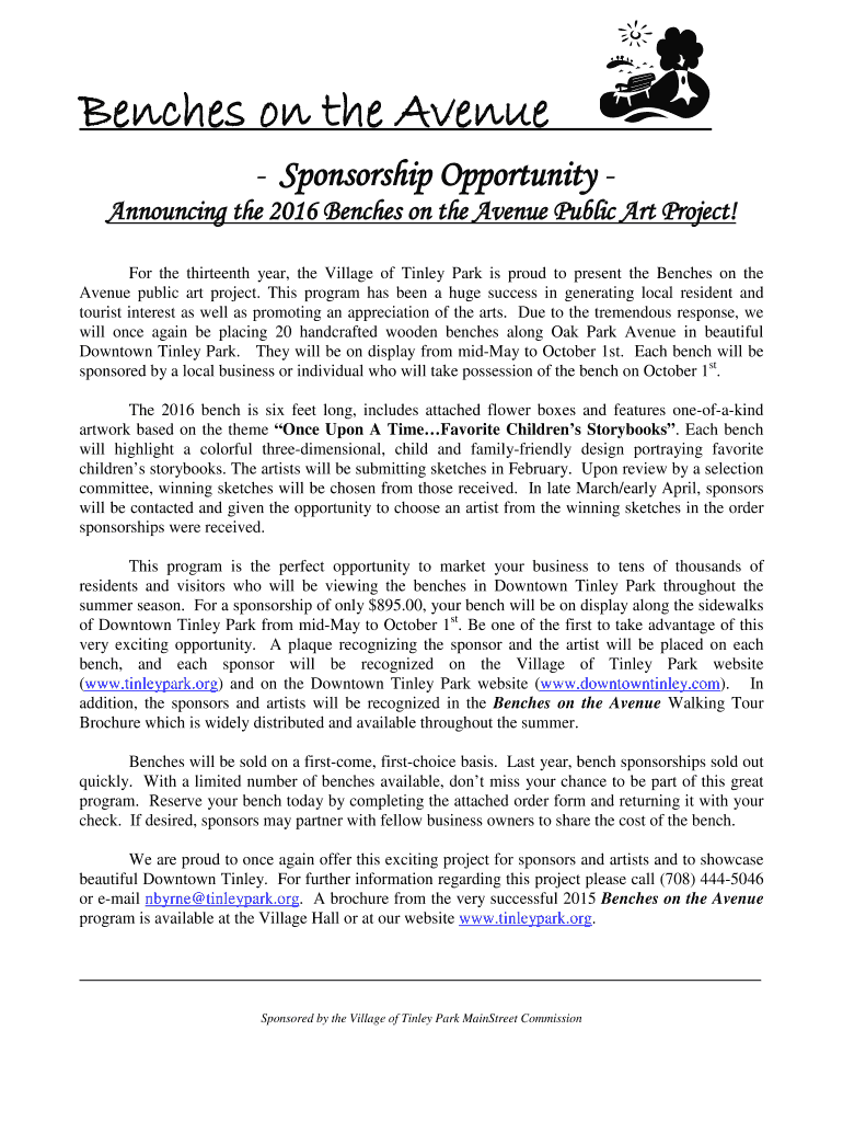 Benches on the Avenue Sponsorship Opportunity Announcing the 2016 Benches on the Avenue Public Art Project! For the thirteenth year, the Village of Tinley Park is proud to present the Benches on the
