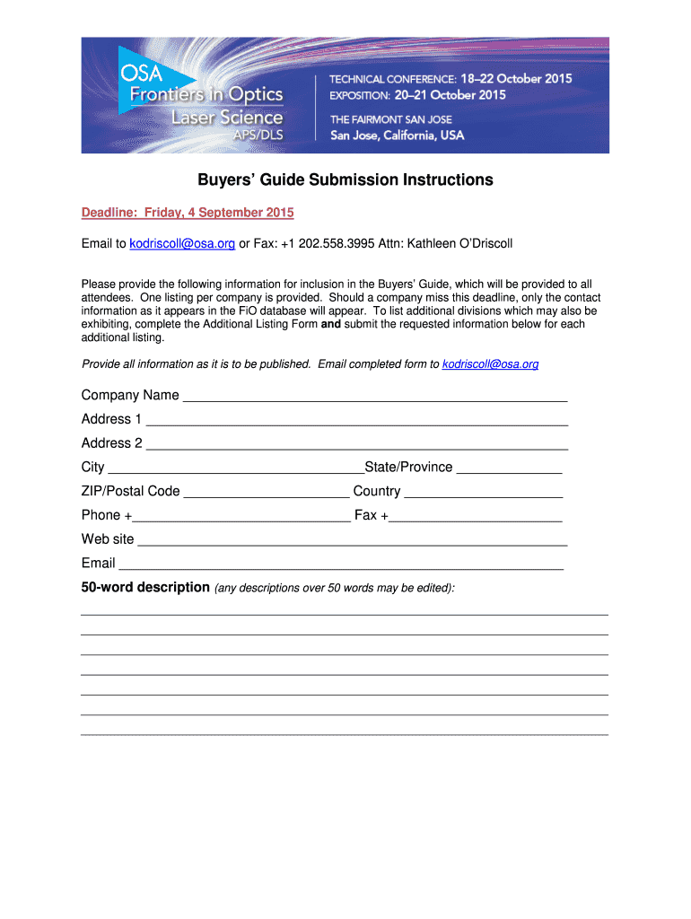 Buyers Guide Submission Instructions. Deadline: Friday, 4 September 2015. Email to Driscoll OSA.org or Fax: +1 202.558.3995 Attn: Kathleen O Driscoll.