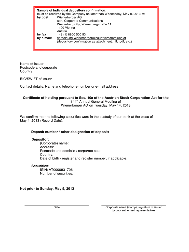 Get the free Individual Depository Confirmation (sample) - Wienerberger