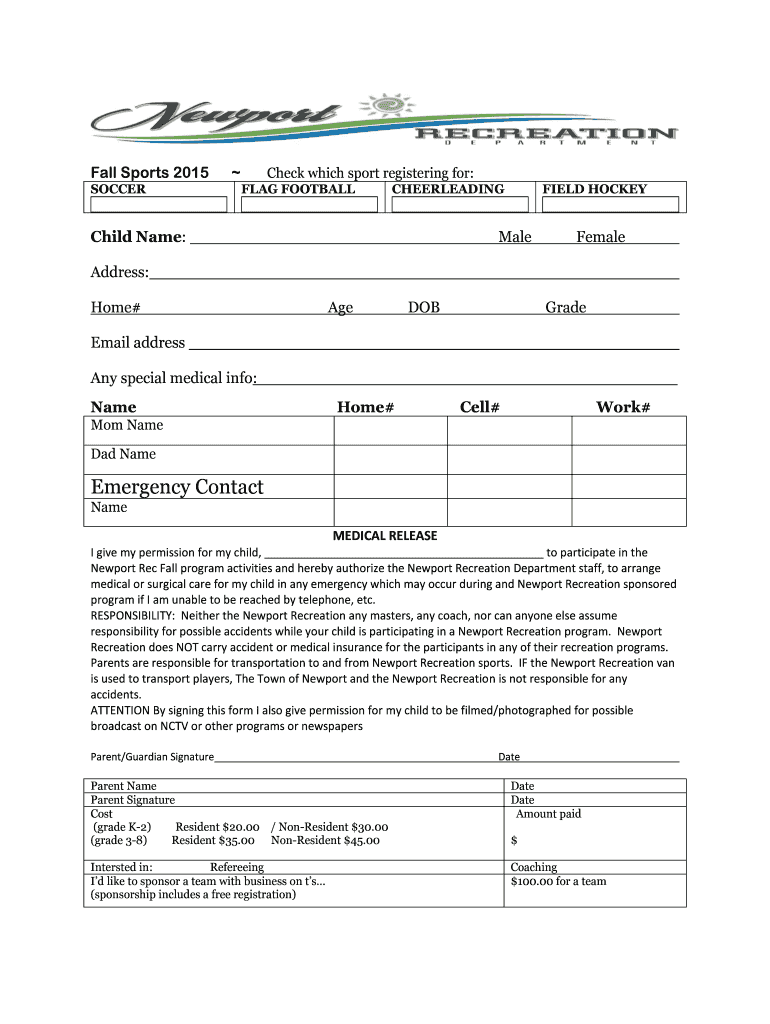 Fall Sports 2015 SOCCER Check which sport registering for: FLAG FOOTBALL CHEERLEADING Child Name: FIELD HOCKEY Male Female Address: Home# Age DOB Grade Email address Any special medical info: Name