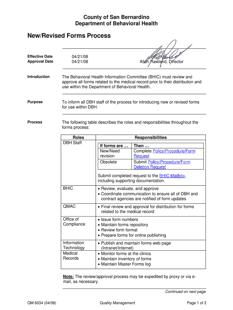 County of San Bernardino Department of Behavioral Health New/Revised Forms Process Effective Date Approval Date 04/21/08 04/21/08 Allan Rowland, Director Introduction The Behavioral Health Information