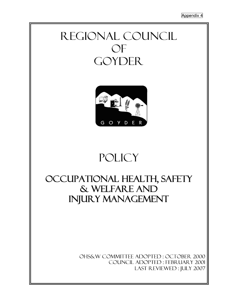 Appendix 4 REGIONAL COUNCIL OF OLDER policy occupational health, safety & welfare and injury management ohs Committee ADOPTED : OCTOBER 2000 COUNCIL Adopted : February 2001 Last reviewed : JULY 2007