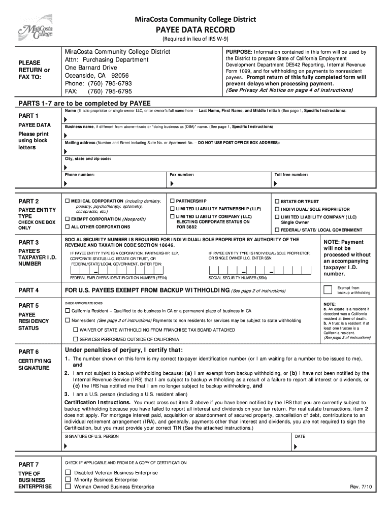 Miracast Community College District PAYEE DATA RECORD (Required in lieu of IRS W9) PLEASE RETURN or FAX TO: Miracast Community College District Attn: Purchasing Department One Barnard Drive Oceanside,