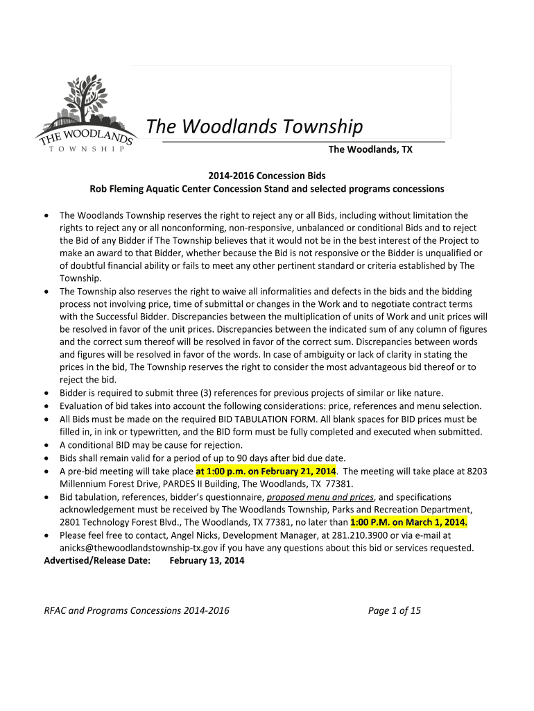 The Woodlands Township The Woodlands, TX 20142016 Concession Bids Rob Fleming Aquatic Center Concession Stand and selected programs concessions The Woodlands Township reserves the right to reject