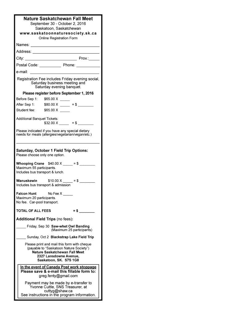 Nature Saskatchewan Fall Meet September 30 – October 2, 2016, Saskatoon, Saskatchewan www.saskatoonnaturesociety.sk.ca Online Registration Form Names: