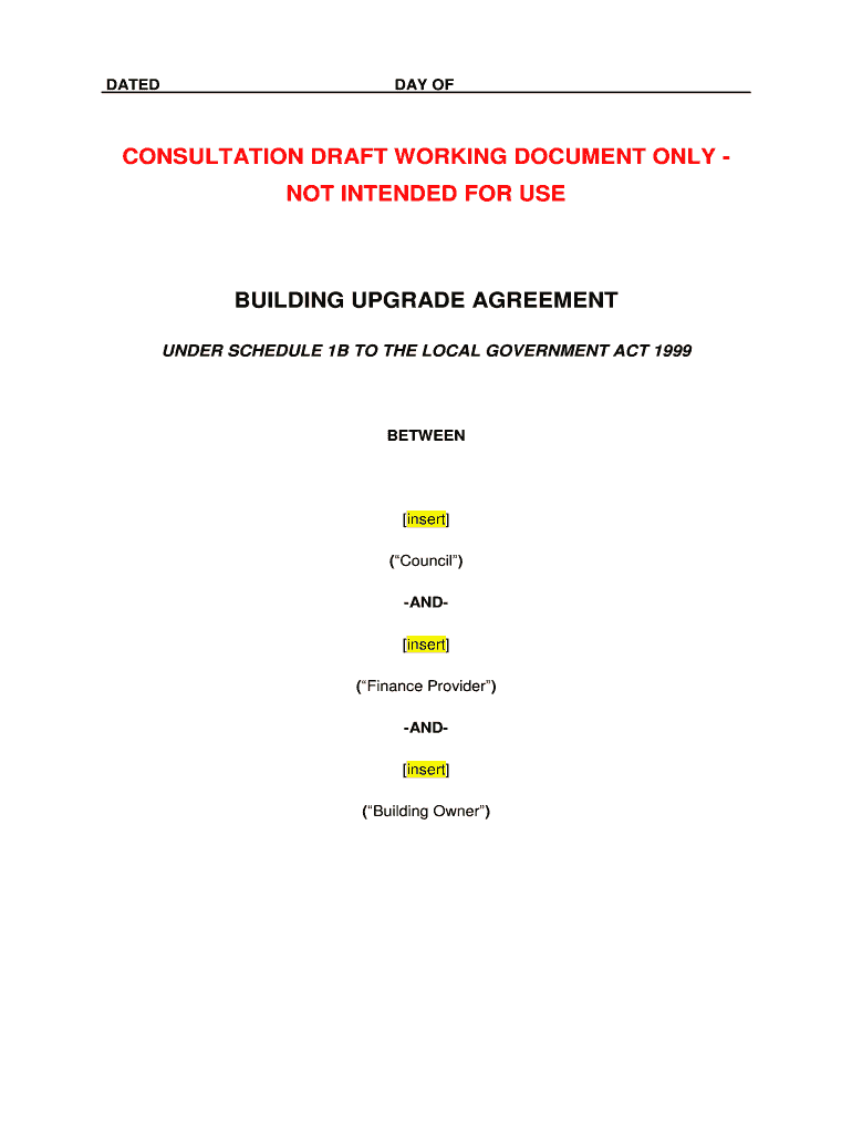 DATED DAY OF CONSULTATION DRAFT WORKING DOCUMENT ONLY NOT INTENDED FOR USE BUILDING UPGRADE AGREEMENT UNDER SCHEDULE 1B TO THE LOCAL GOVERNMENT ACT 1999 BETWEEN insert (Council) AND insert (Finance