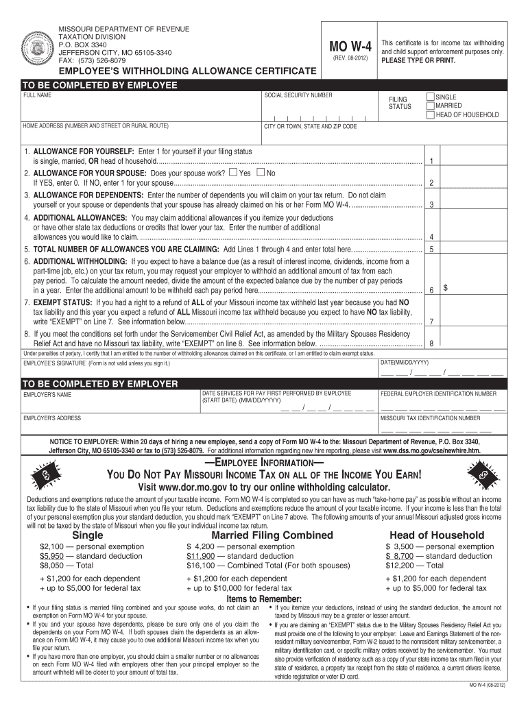 Print Form Reset Form MISSOURI DEPARTMENT OF REVENUE TAXATION DIVISION P.O. BOX 3340 JEFFERSON CITY, MO 65105-3340 FAX: (573) 526-8079 MO W -4 (REV. 08-2012) This certificate is for income tax withholding