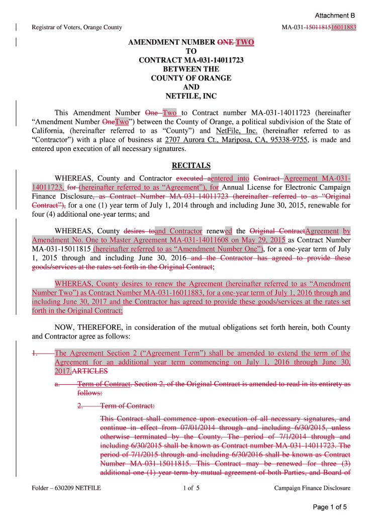 Attachment B Registrar of Voters, Orange County MA0311501181516011883 AMENDMENT NUMBER ONE TWO TO CONTRACT MA03114011723 BETWEEN THE COUNTY OF ORANGE AND NETTLE, INC This Amendment Number One Two