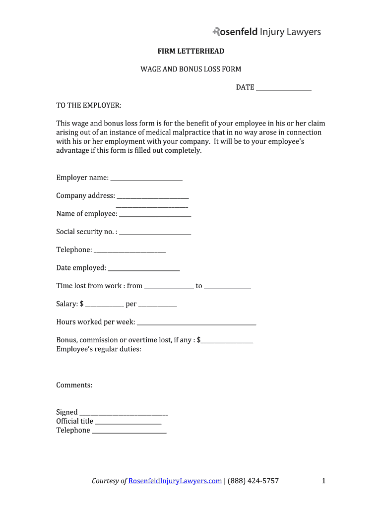 FIRM LETTERHEAD WAGE AND BONUS LOSS FORM DATE TO THE EMPLOYER: This wage and bonus loss form is for the benefit of your employee in his or her claim arising out of an instance of medical malpractice