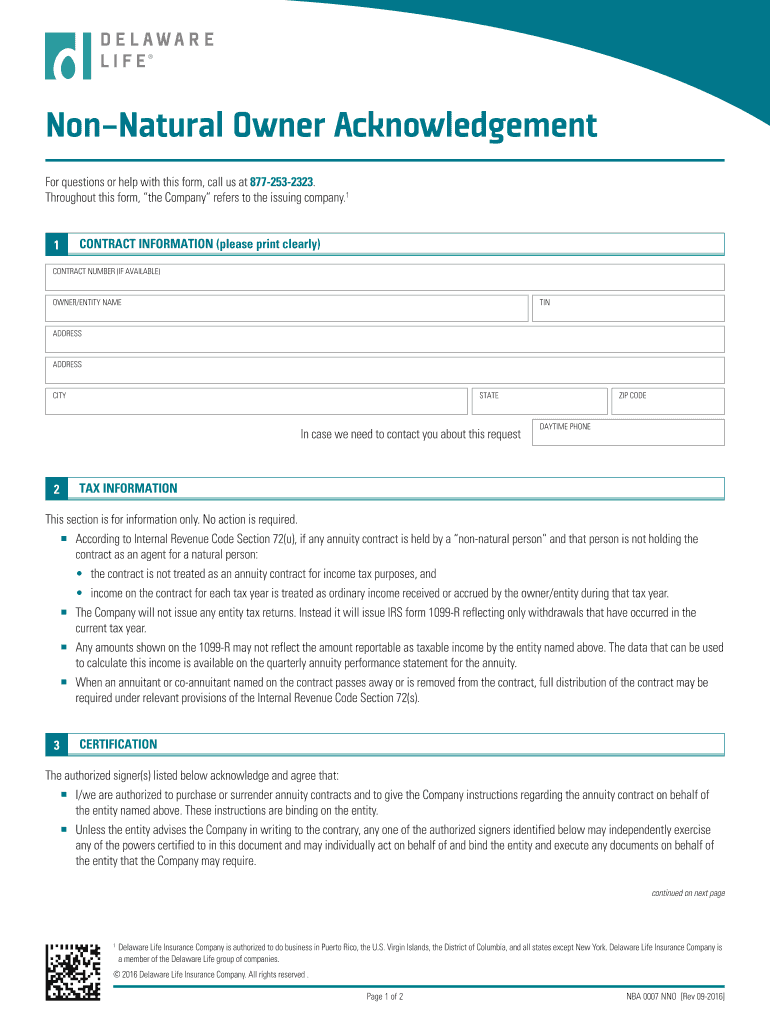 NBA 0007 NO Rev 09-2016 ... 2016 Delaware Life Insurance Company. ... If this form is submitted in connection an application for an annuity contract, the ...