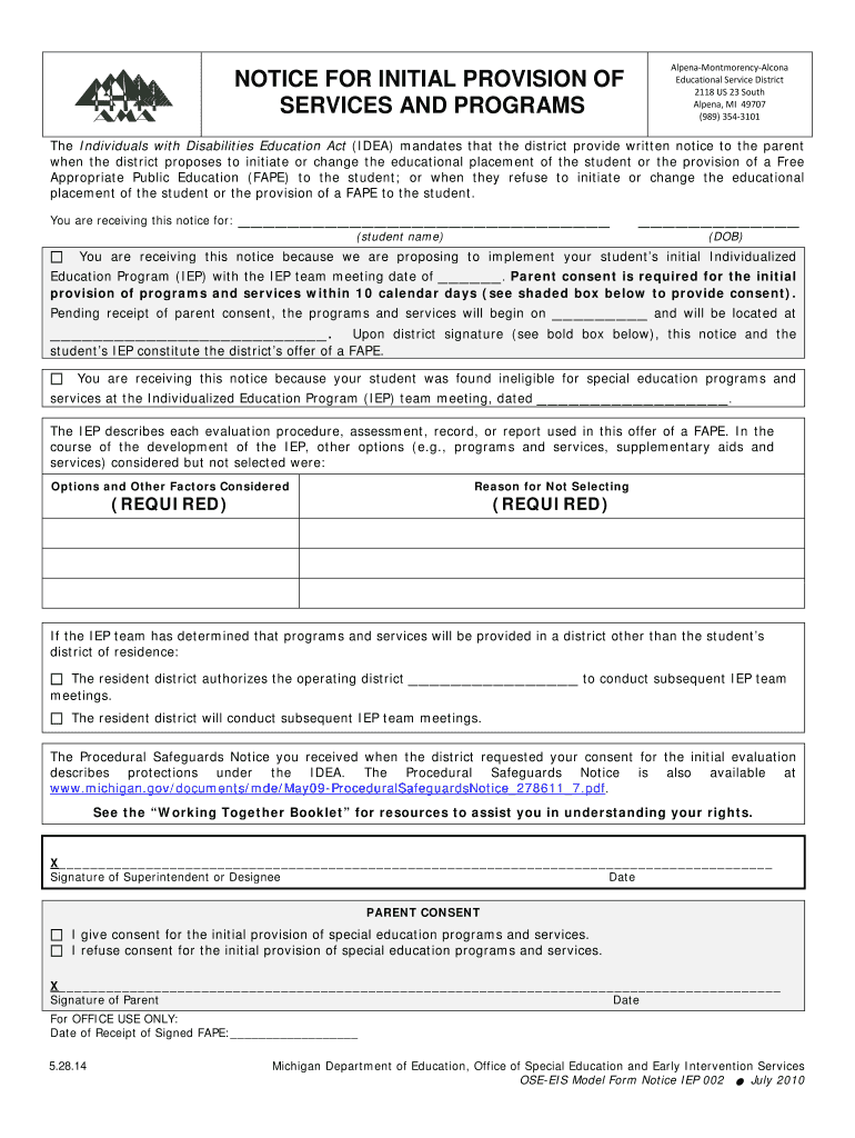 AlpenaMontmorencyAlcona Educational Service District 2118 US 23 South ALENA, MI 49707 (989) 3543101 NOTICE FOR INITIAL PROVISION OF SERVICES AND PROGRAMS The Individuals with Disabilities Education