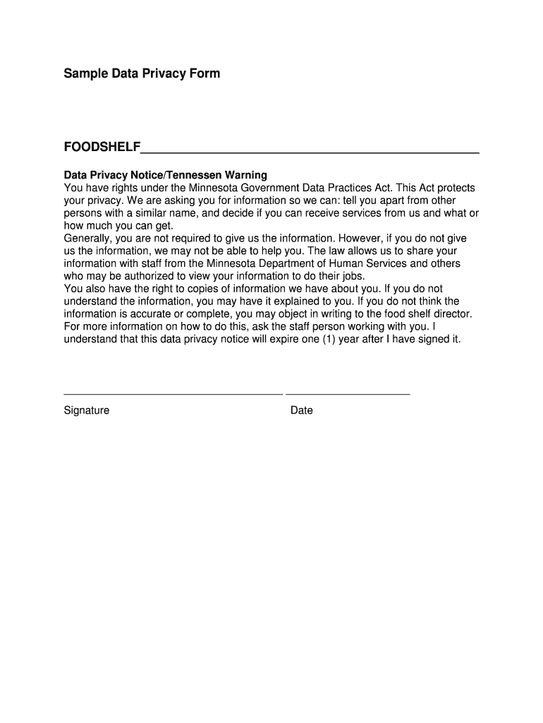 Sample Data Privacy Form BOOKSHELF Data Privacy Notice/Tennessee Warning You have rights under the Minnesota Government Data Practices Act. This Act protects your privacy. We are asking you for information,