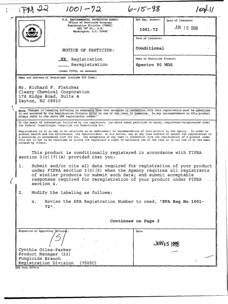 100) u.s. 7:;; ENVIRONMENT 'I 'AL PROTECTION AGENCY Office of Pesticide EPA R9. Number: Programs Date of Issuance: Registration Division (750SC) 401 “M St., S.W. Washington. D. C 20460 JUN 15 1998