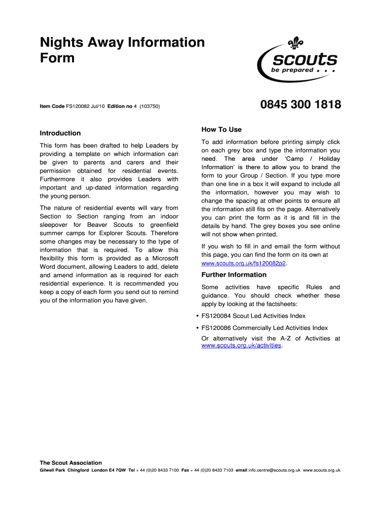 Nights Away Information Form 0845 300 1818 Item Code FS120082 Jul/10 Edition no 4 (103750) Introduction This form has been drafted to help Leaders by providing a template on which information can