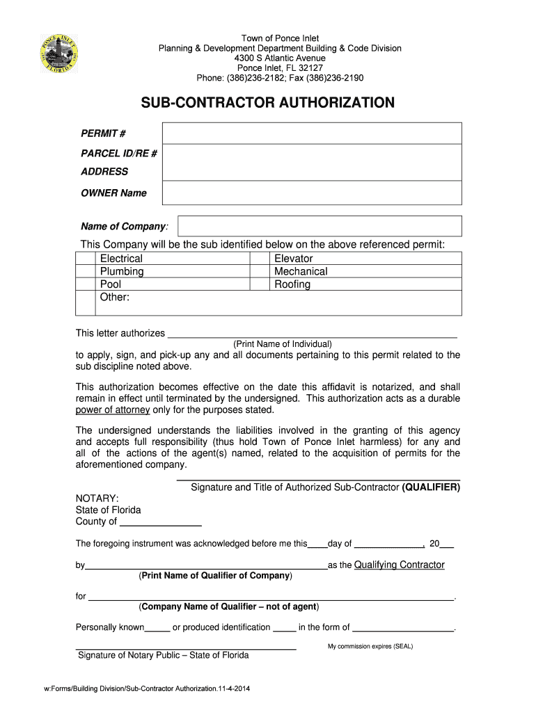Get the free SUB-CONTRACTOR Authorization form.doc - ponce-inlet