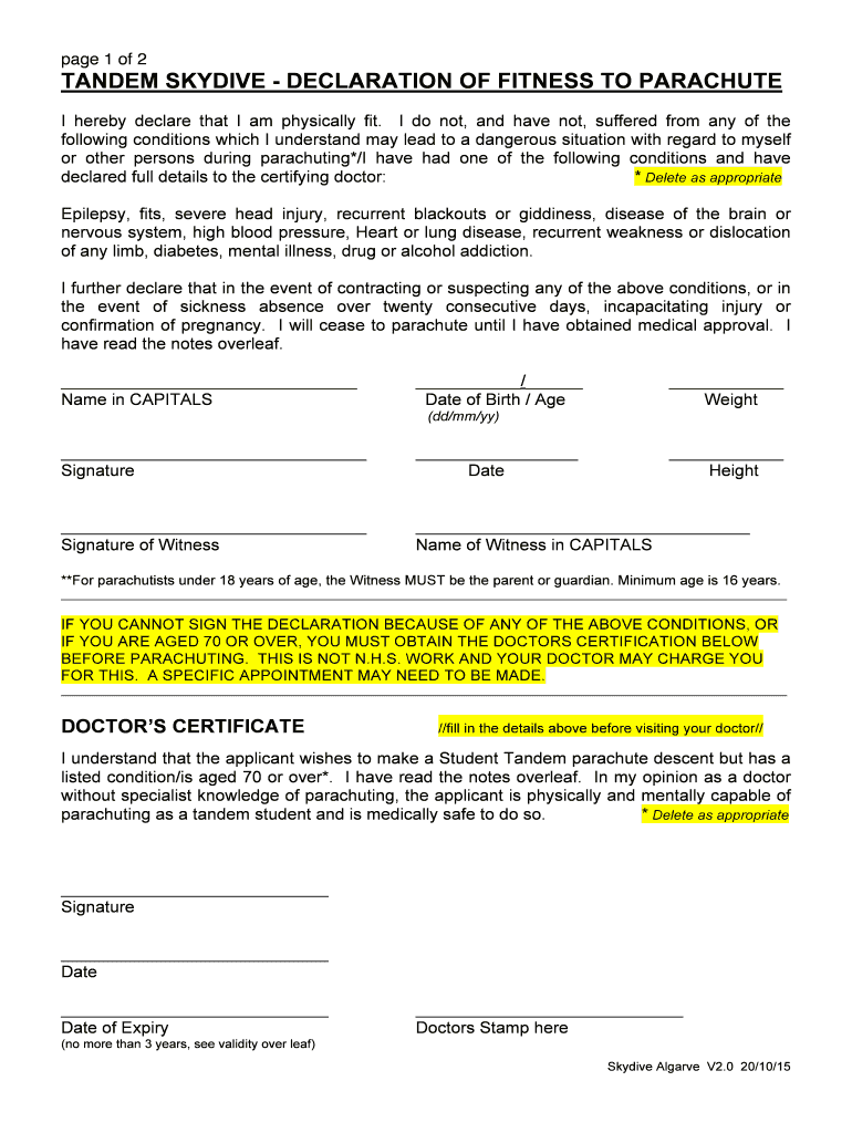 Page 1 of 2 TANDEM SKYDIVE DECLARATION OF FITNESS TO PARACHUTE I hereby declare that I am physically fit. I do not, and have not, suffered from any of the following conditions which I understand may
