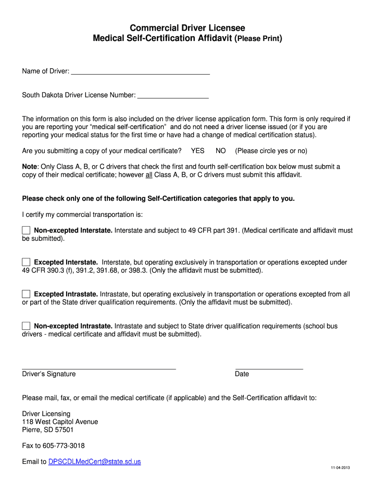 Commercial Driver Licensee Medical Recertification Affidavit (Please Print) Name of Driver: South Dakota Driver License Number: The information on this form is also included on the driver license