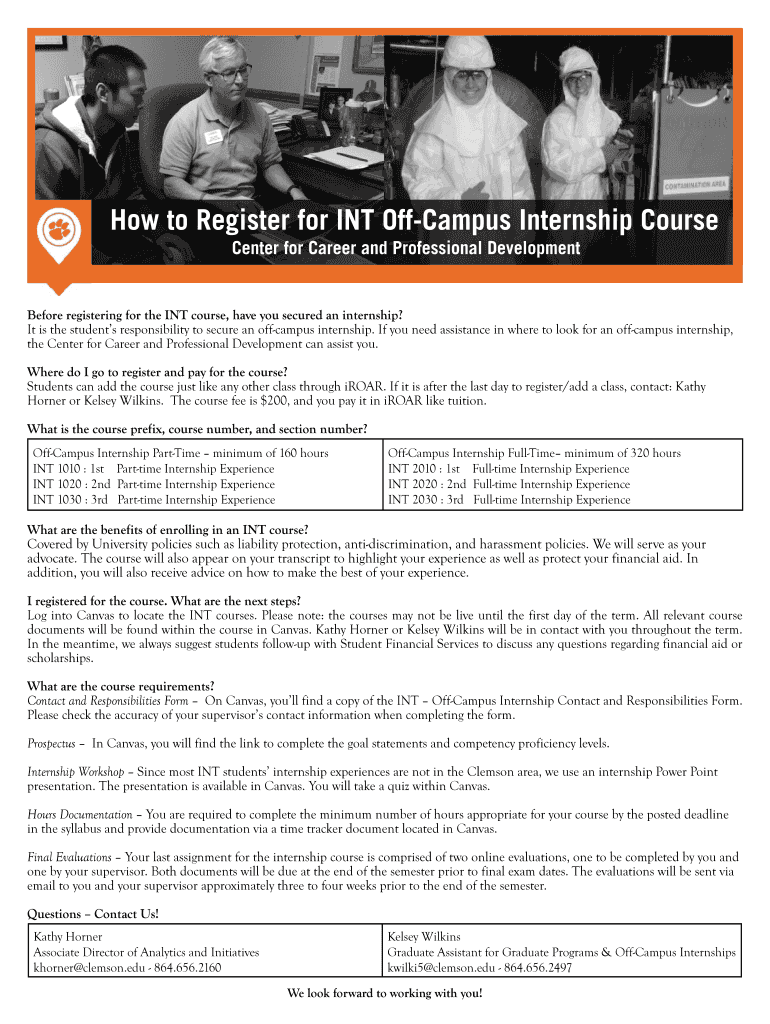 Get the free How to Register for INT Off-Campus Internship Course - career sites clemson