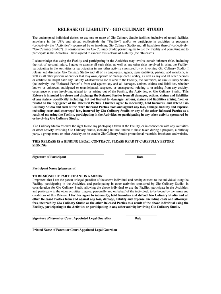 Get the free RELEASE OF LIABILITY - GIO CULINARY STUDIO