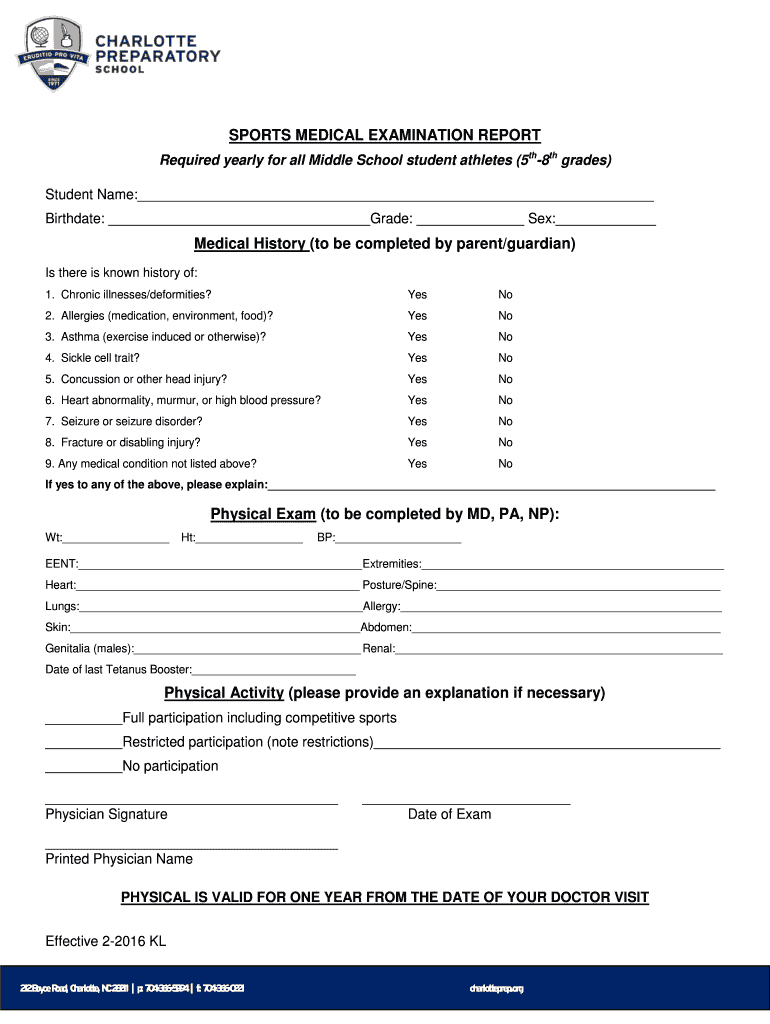 Get the free SPORTS MEDICAL EXAMINATION REPORT - charlotteprep