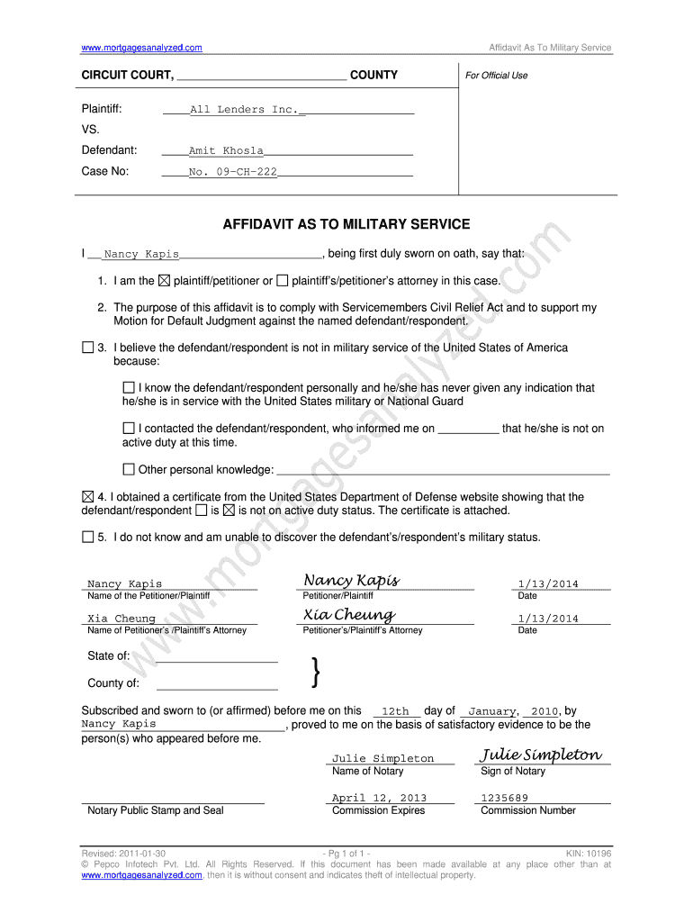 WWW.mortgagesanalyzed.com Affidavit As To Military Service CIRCUIT COURT, COUNTY Plaintiff: For Official Use All Lenders Inc. VS. Defendant: Amit Khosla Case No: No. 09CH222 AFFIDAVIT AS TO MILITARY