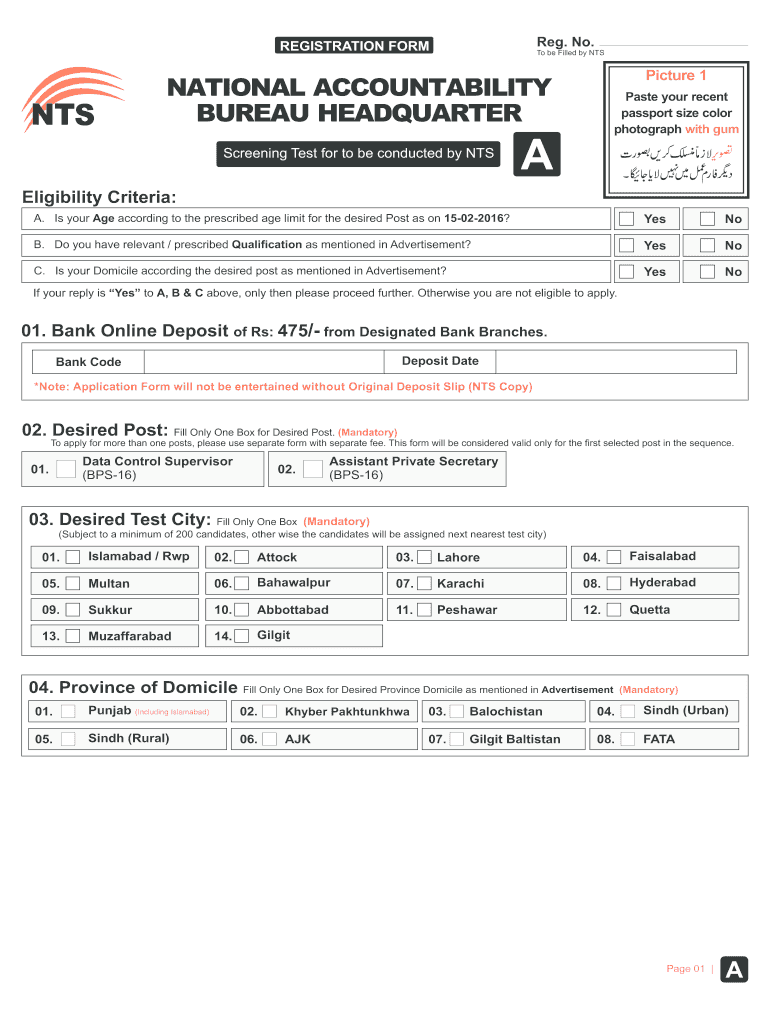 Reg. No. REGISTRATION FORM NTS To be Filled by NTS Picture 1 NATIONAL ACCOUNTABILITY BUREAU HEADQUARTER Screening Test for to be conducted by NTS Paste your recent passport size color photograph with