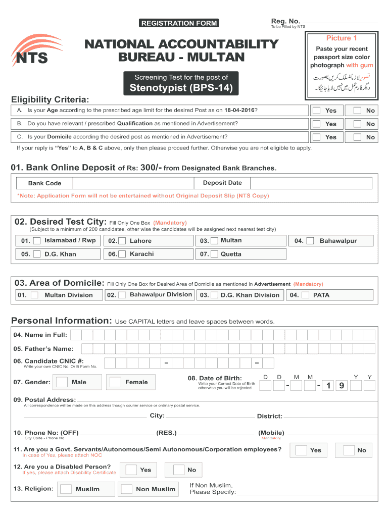 Reg. No. REGISTRATION FORM To be Filled by NTS Picture 1 NATIONAL ACCOUNTABILITY BUREAU MULTAN NTS Paste your recent passport size color photograph with gum Screening Test for the post of Steno typist