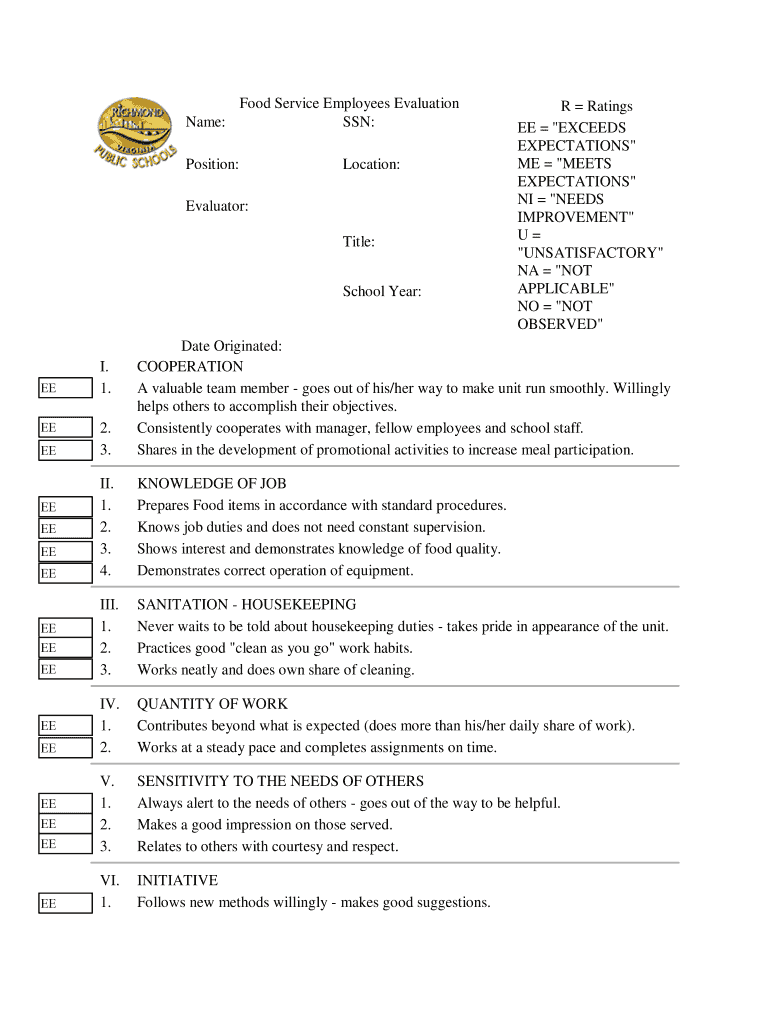 Food service employees evaluations can be filled out by assessing an employee's job performance, skills, and areas for improvement on a standardized form.
