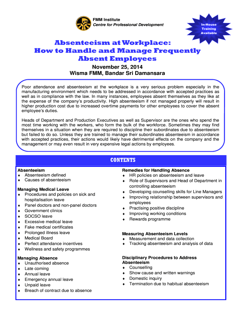 FMM Institute Center for Professional Development In House Training Available Absenteeism at Workplace: How to Handle and Manage Frequently Absent Employees November 25, 2014, Wilma FMM, Band Sri
