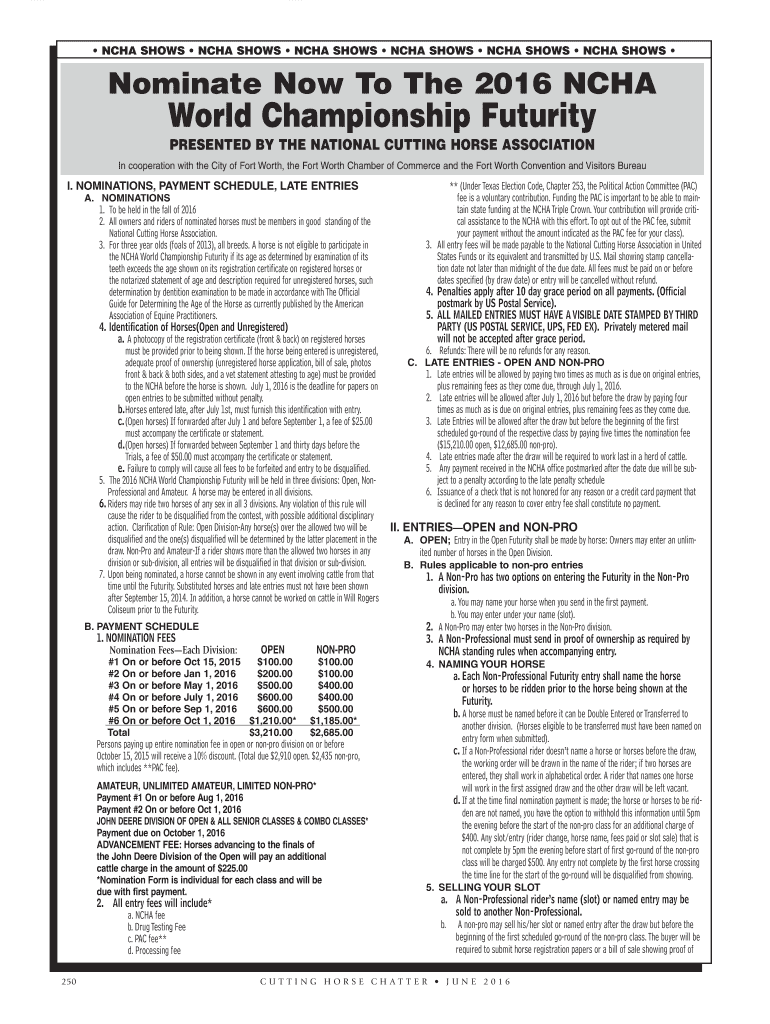 NCAA SHOWS Nominate Now To The 2016 NCAA World Championship Futurity PRESENTED BY THE NATIONAL CUTTING HORSE ASSOCIATION In cooperation with the City of Fort Worth, the Fort Worth Chamber of Commerce