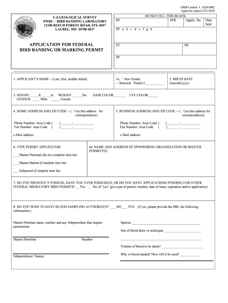 OMB Control # 10280082 Approval expires:3/31/2019 U.S.GEOLOGICAL SURVEY PRC BIRD BANDING LABORATORY 12100 BEECH FOREST ROAD, STE4037 LAUREL, MD 207084037 APPLICATION FOR FEDERAL BIRD BANDING OR MARKING