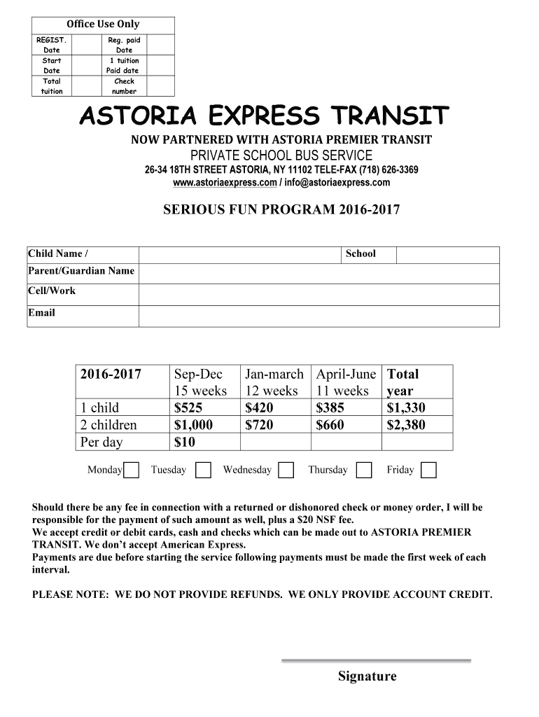Office&Use&Only&& RESIST. Date Reg. Paid Date Start Date 1 tuition Paid date Total tuition Check number ASTORIA EXPRESS TRANSIT.