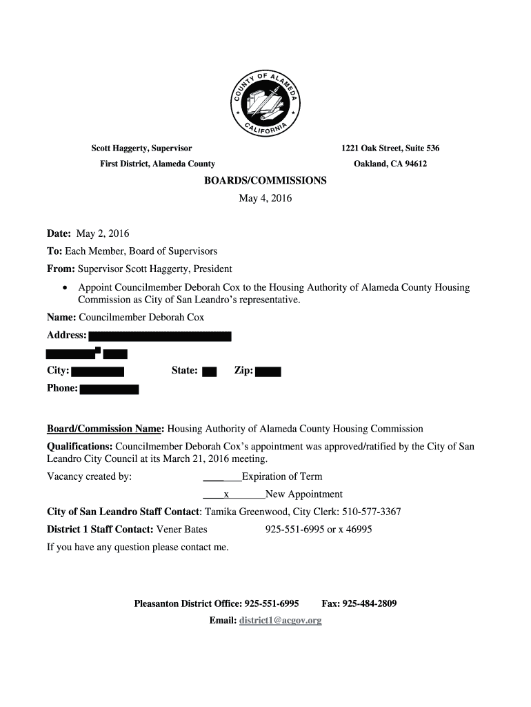 Scott Haggerty, Supervisor 1221 Oak Street, Suite 536 First District, Alameda County Oakland, CA 94612 BOARDS/COMMISSIONS May 4, 2016, Date: May 2, 2016, To: Each Member, Board of Supervisors From: