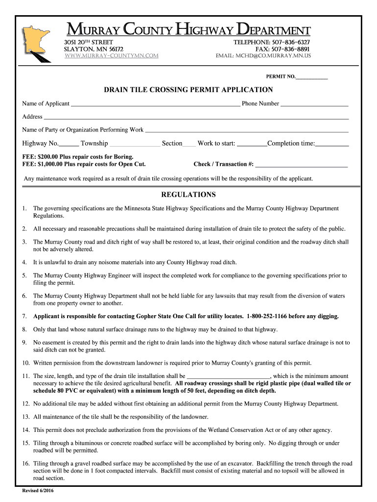 Revised 6/2016. MURRAY COUNTY HIGHWAY ... MURRAY.MN.US. PERMIT NO. . DRAIN TILE CROSSING PERMIT APPLICATION. Name of Applicant ...