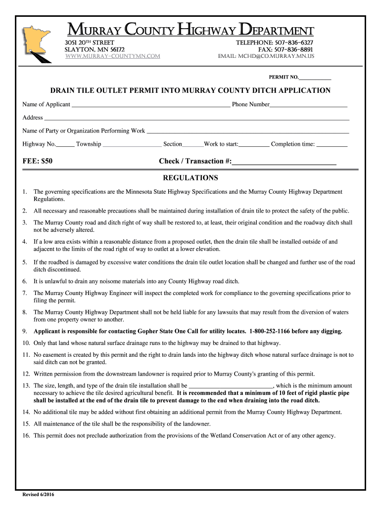 Revised 6/2016. MURRAY COUNTY HIGHWAY ... MN.US. PERMIT NO. . DRAIN TILE OUTLET PERMIT INTO MURRAY COUNTY DITCH APPLICATION.