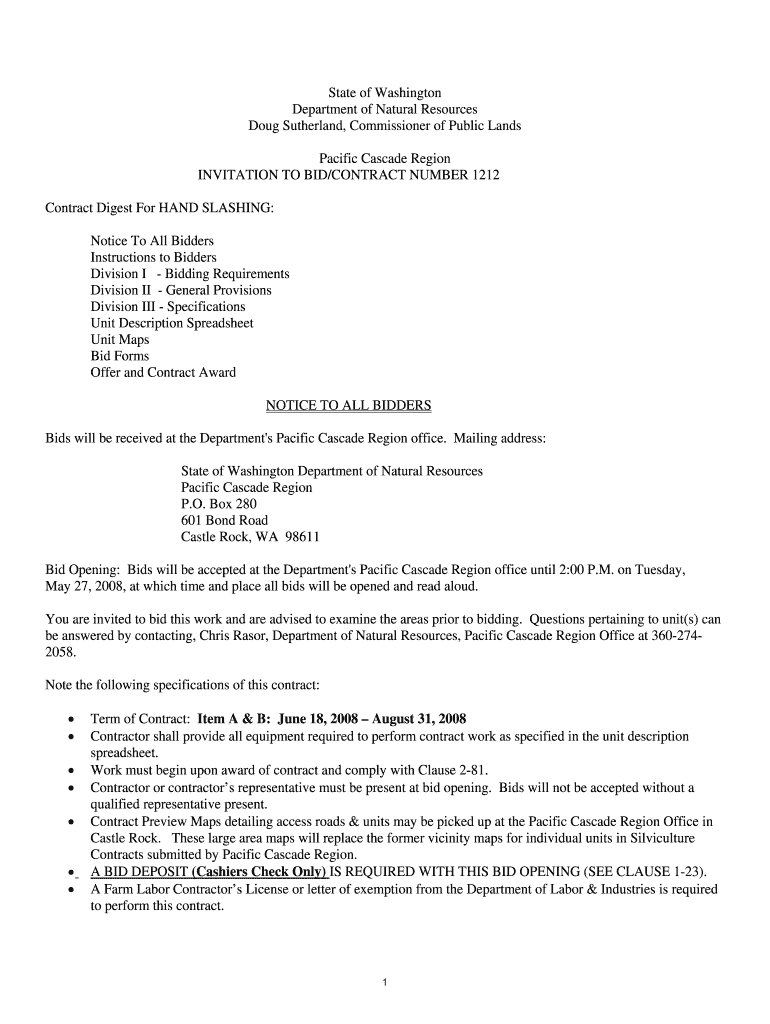 State of Washington Department of Natural Resources Doug Sutherland, Commissioner of Public Lands Pacific Cascade Region INVITATION TO BID/CONTRACT NUMBER 1212 Contract Digest For HAND SLASHING: Notice