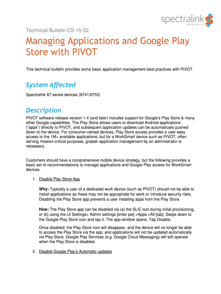Technical Bulletin CS1502Managing Applications and Google Play Store with PIVOT This technical bulletin provides some basic application management best practices with PIVOT. System Affected Spectra
